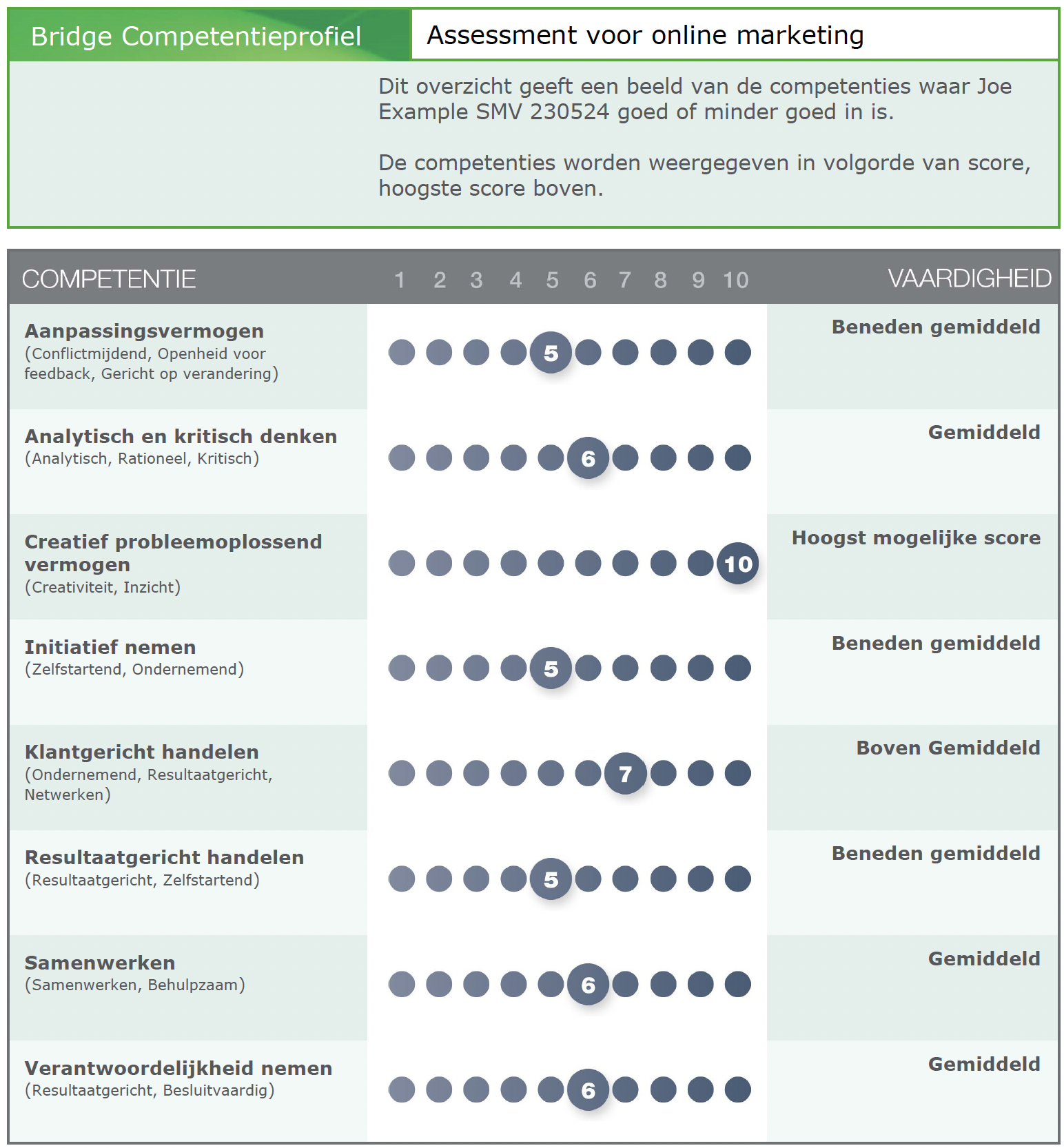 Hier kun je een voorbeeldrapport bekijken van het online marketing assessment. Dit rapport geeft uitgebreid inzicht in scores op de 34 Big Five competenties, de 4 kleuren en de 8 specifieke competenties die belangrijk zijn voor het werken in online marketing functies. Denk aan resultaatgericht handelen, analytisch denken en klant en doelgroepgericht gedrag. Het is mogelijk om het rapport aan te passen door andere competenties toe te voegen die passen bij jouw functieprofiel. Voor de capaciteitentest wordt een apart rapport opgesteld.